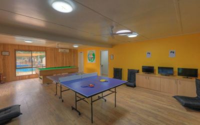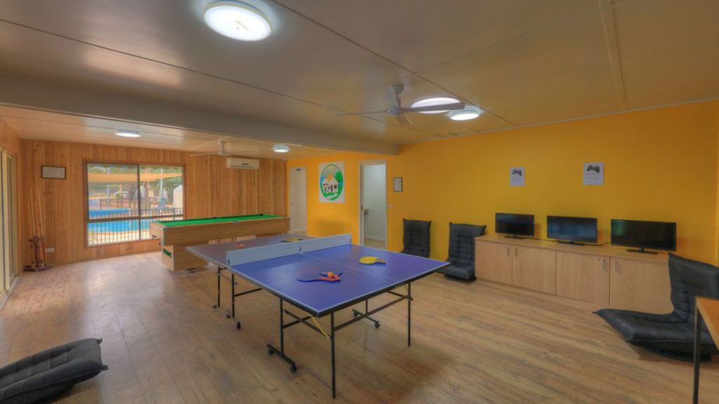 Now the kitchen is the same full kitchen it always was, but without a dishwasher. Plenty of equipment and space. There is a lovely room for eating and relaxing, plus space on the generous verandah. The games room has a separate entrance from the camp kitchen, but still links to the kitchen and the two shared toilets. There is a pool table, table tennis table, Playstations and TV, with low seats – they are interesting to get up from!